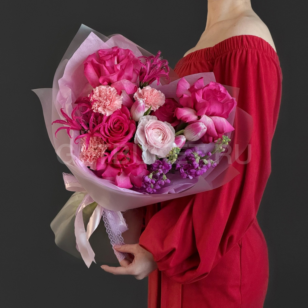 Яркий букет из роз, тюльпанов и ранункулюса