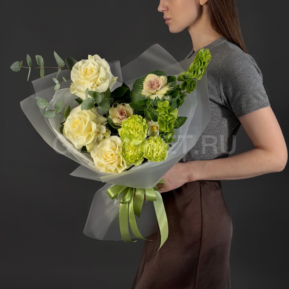 Букет из белых роз, молюцеллы и брассики