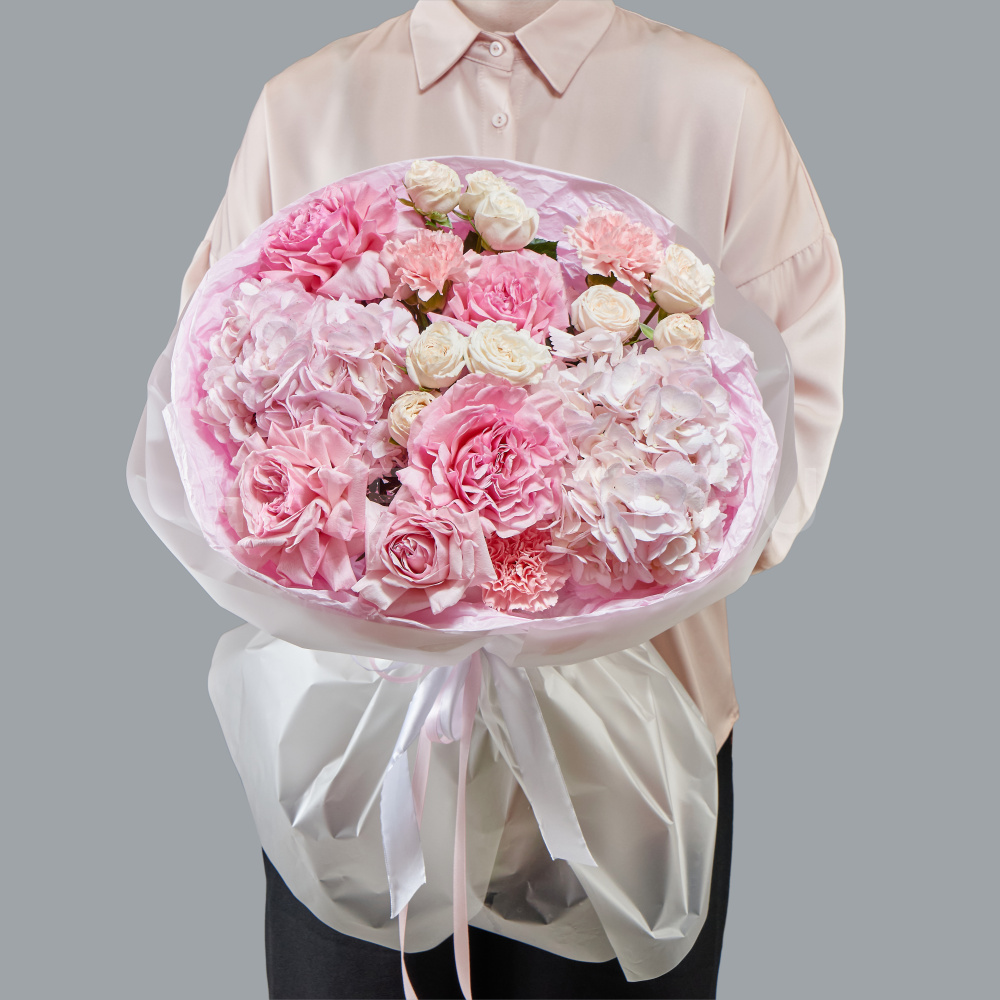 Букет из роз, гвоздик и розовой гортензии с эустомой20 850 ₽Букет из роз, гвоздик и розовой гортензии с эустомой 20 850 ₽ -