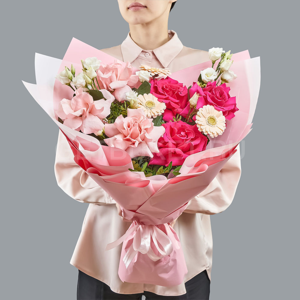Розовый букет роз, гербер и эустомы