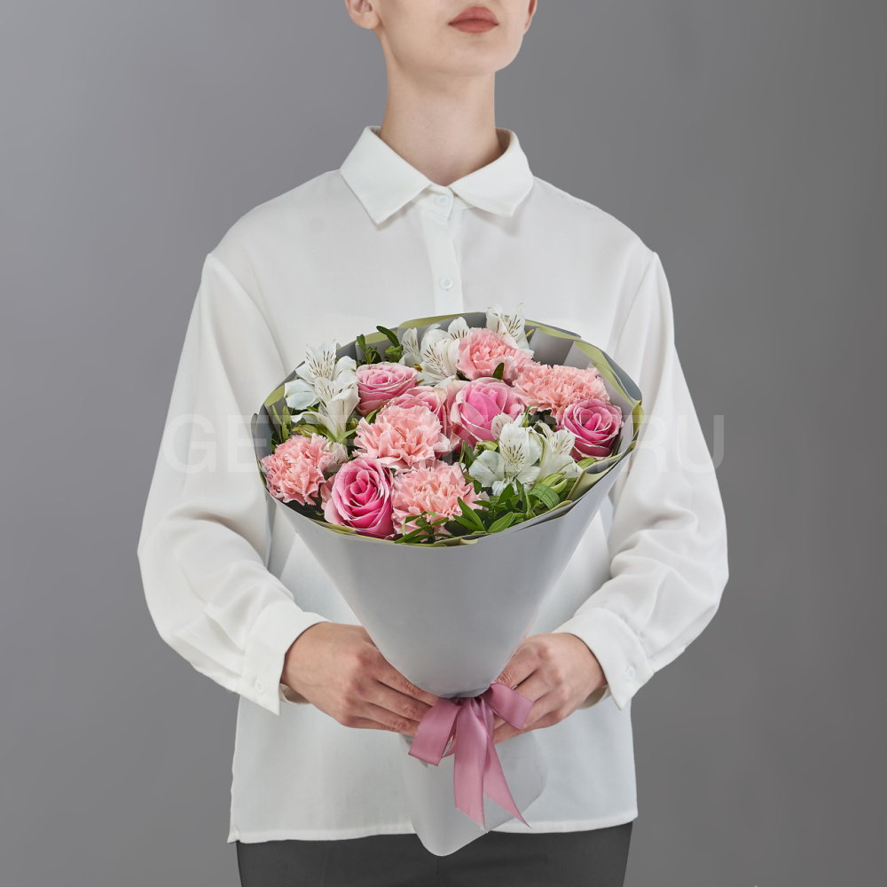 Букет из розовых гвоздик, роз и альстромерий4 070 ₽Букет из розовых гвоздик, роз и альстромерий 4 070 ₽ -
