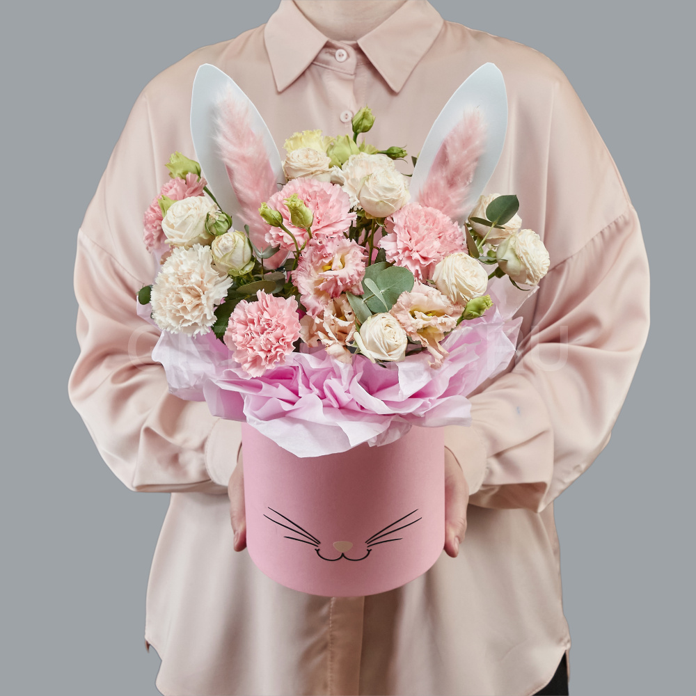 Детская композиция из гвоздик, эустомы и кустовых роз в шляпной коробке