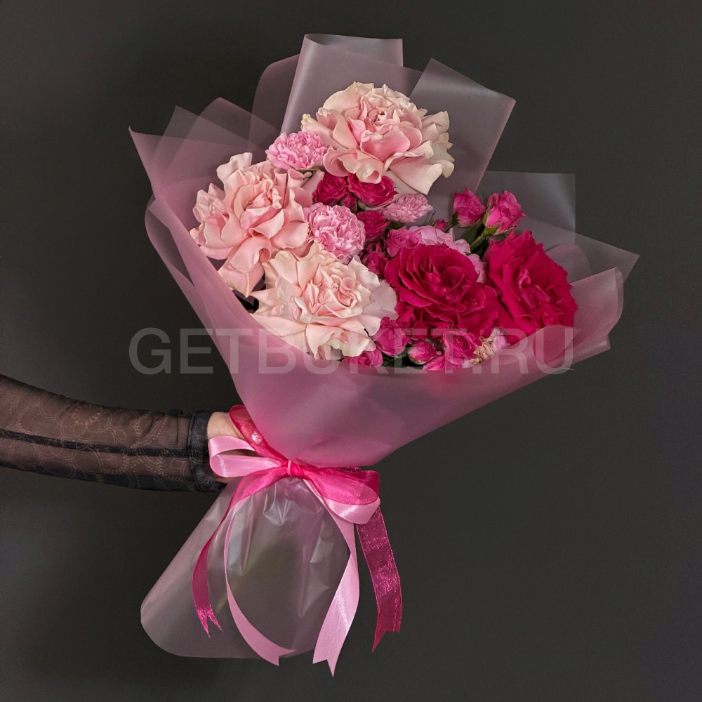 Букет красно-розовых роз с гвоздикой
