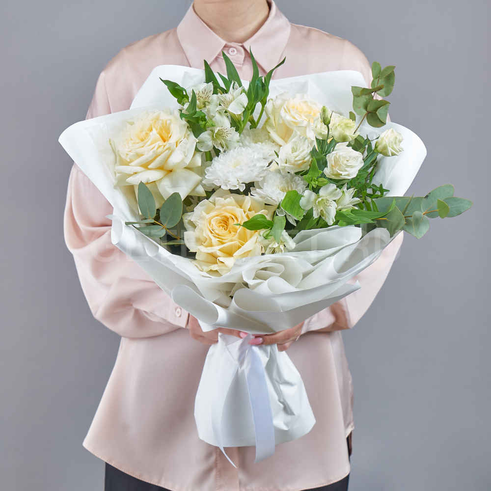 Букет из белых роз с эустомой и хризантемой