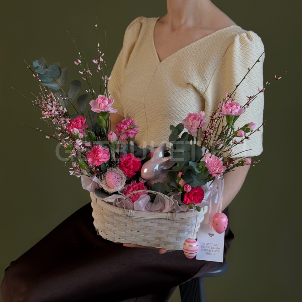 Цветочная композиция с гвоздиками, нарциссами и вербой в плетеной корзине5 850 ₽Цветочная композиция с гвоздиками, нарциссами и вербой в плетеной корзине 5 850 ₽ -