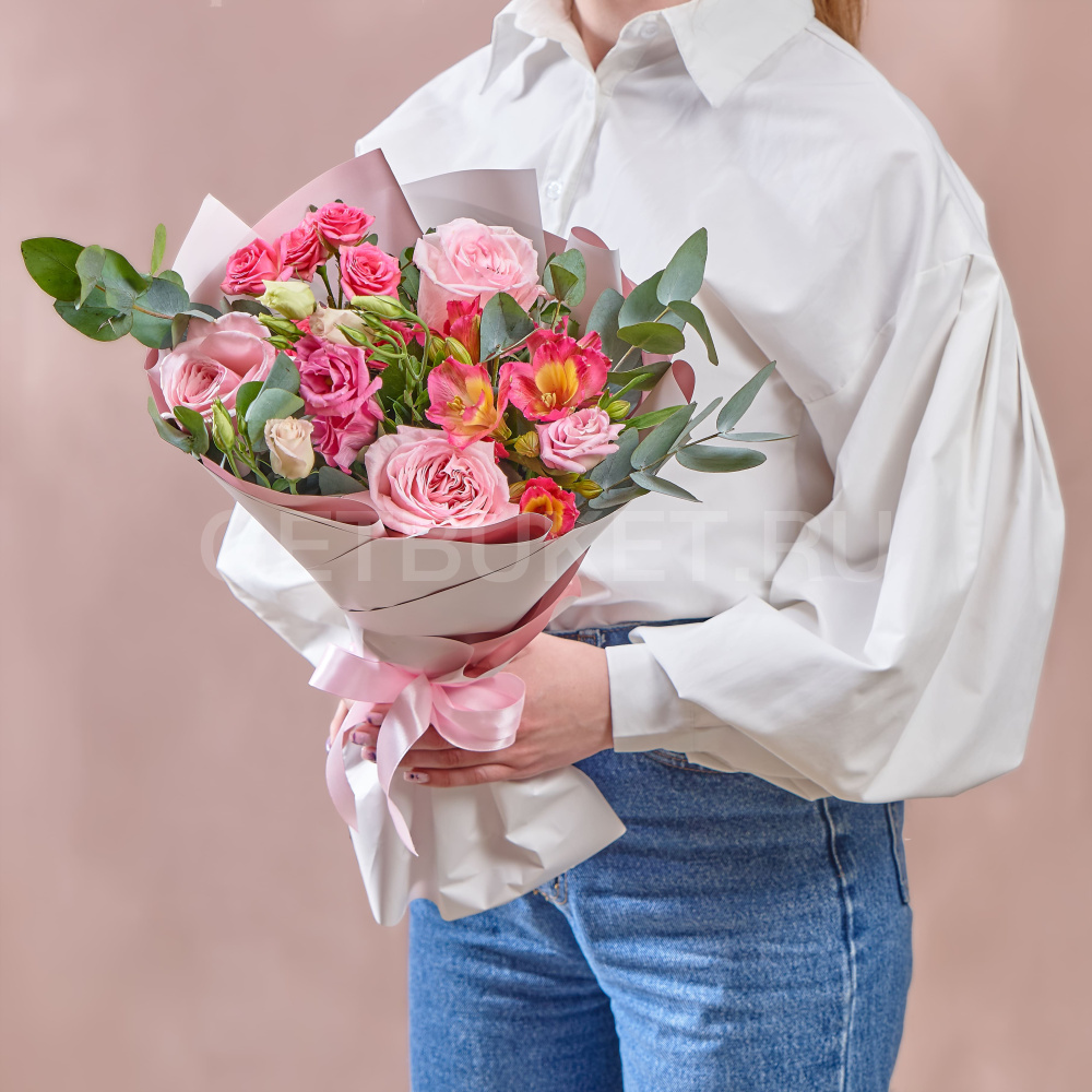 Букет из розовых роз с гвоздиками и эустомой9 090 ₽Букет из розовых роз с гвоздиками и эустомой 9 090 ₽ -