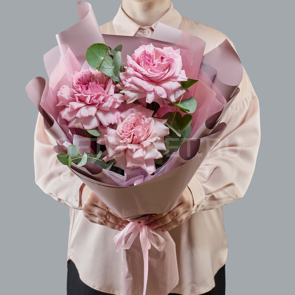 Букет из трех роз с эвкалиптом