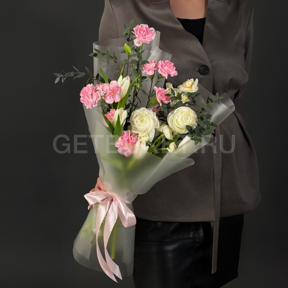 Букет из ранункулюсов с тюльпаном и нарциссом